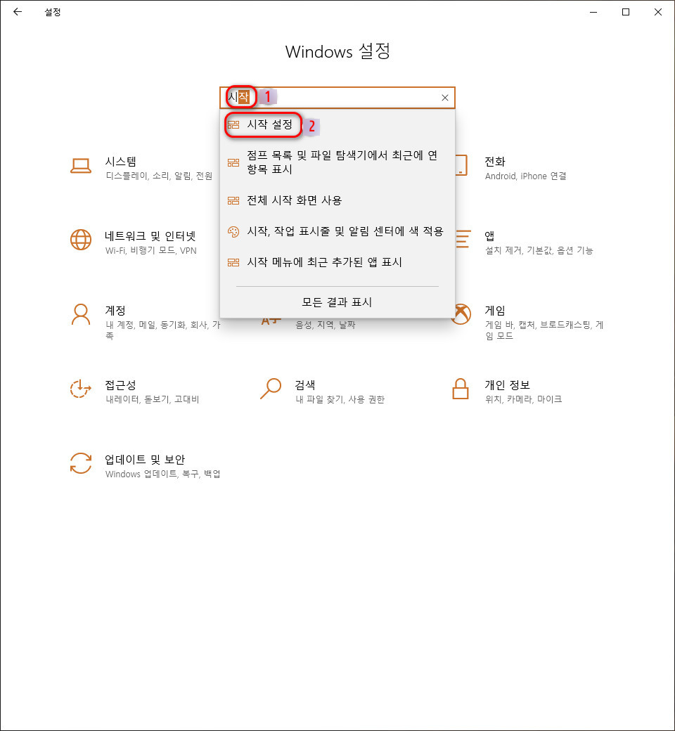Windows의 "시작" 옆에 있는 "돋보기"모양의 검색창에 "시작 설정"을 입력하거나, "시작"에 마우스 오른쪽 클릭을 하여 "설정"으로 들어갑니다.