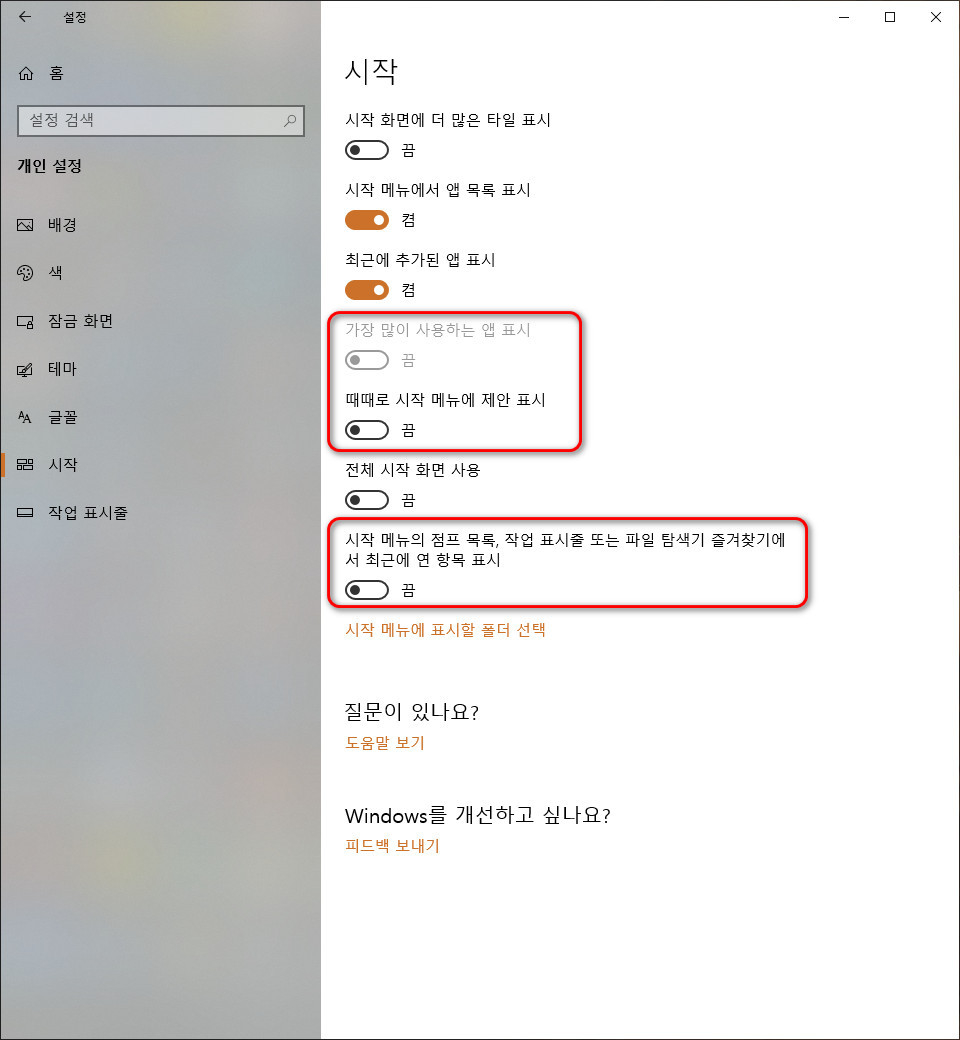마지막으로 "파일 탐색기"를 실행하시고 메뉴의 "보기" - "옵션" - "폴더 옵션"에서 "개인 정보 보호"에 있는 체크박스를 모두 해제