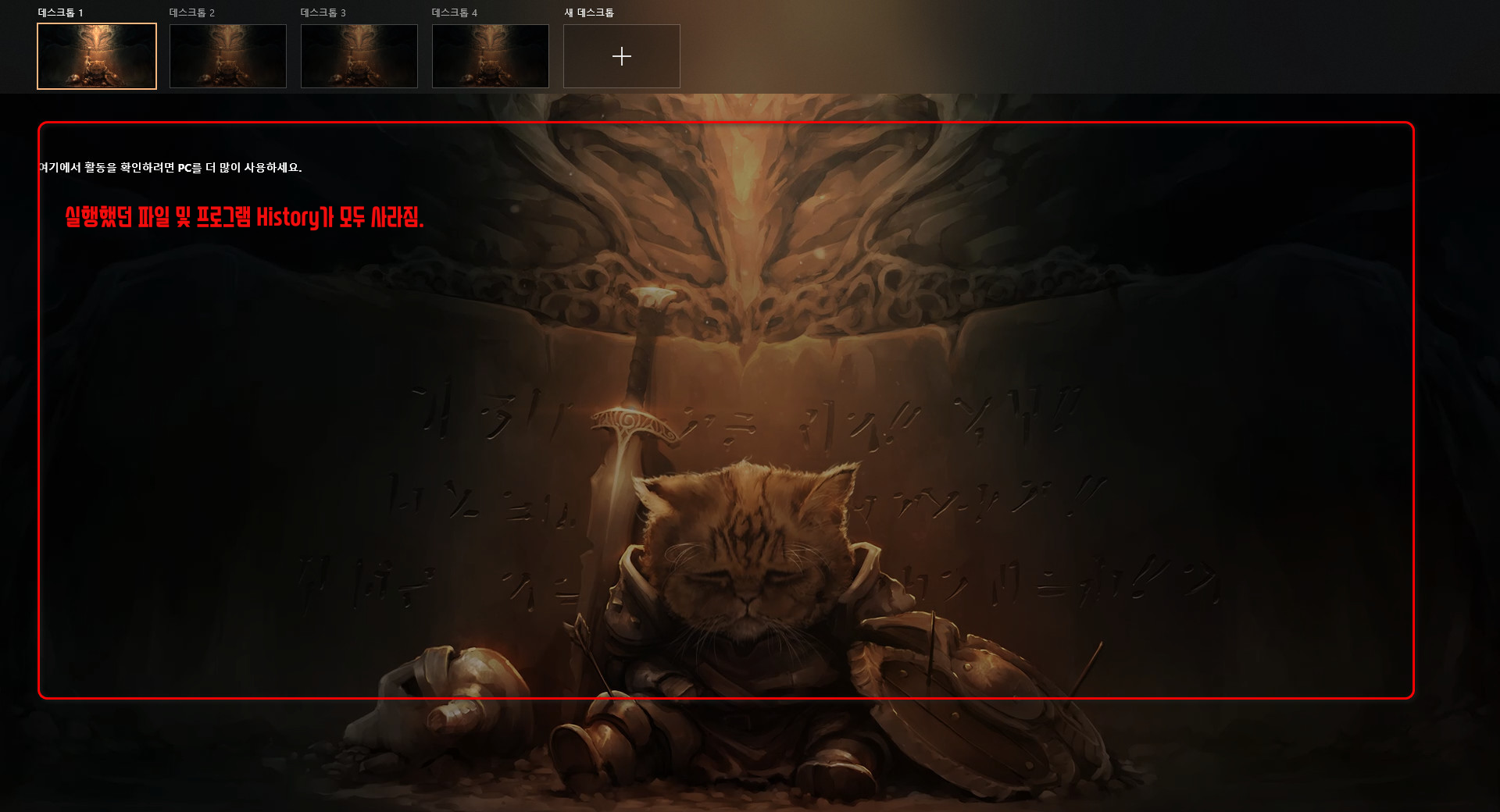 키보드 WIN + TAB 키를 누르거나 "작업 보기"를 클릭했을 때 사용자가 기존에 작업한 파일, 동영상, 프로그램 등 타임라인을 확인할 수 있습니다.
