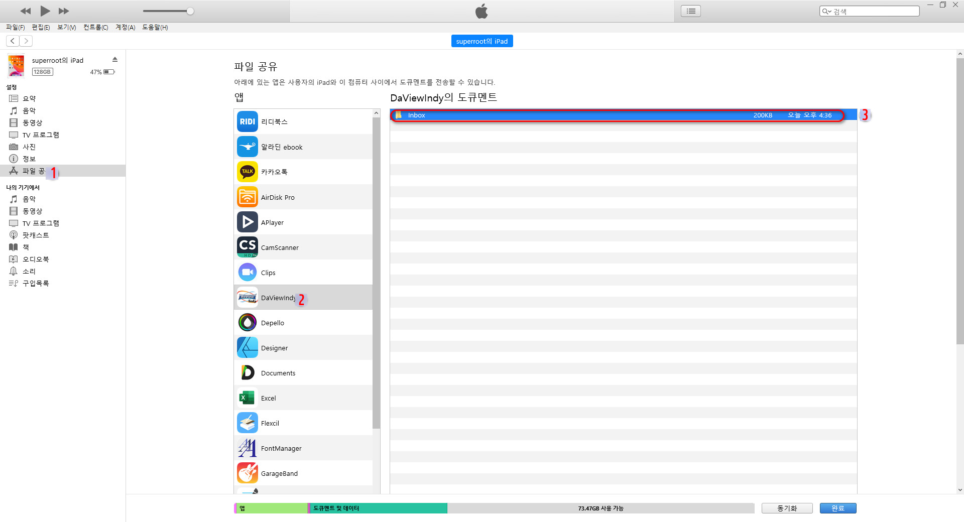 iPad를 컴퓨터와 케이블로 연결을 하고 iTunes를 실행합니다(보통 자동실행 됩니다). iTunes에서 아이패드를 선택하고 "파일 공유"-> "DaViewIndy" -> "Inbox"를 클릭합니다.
