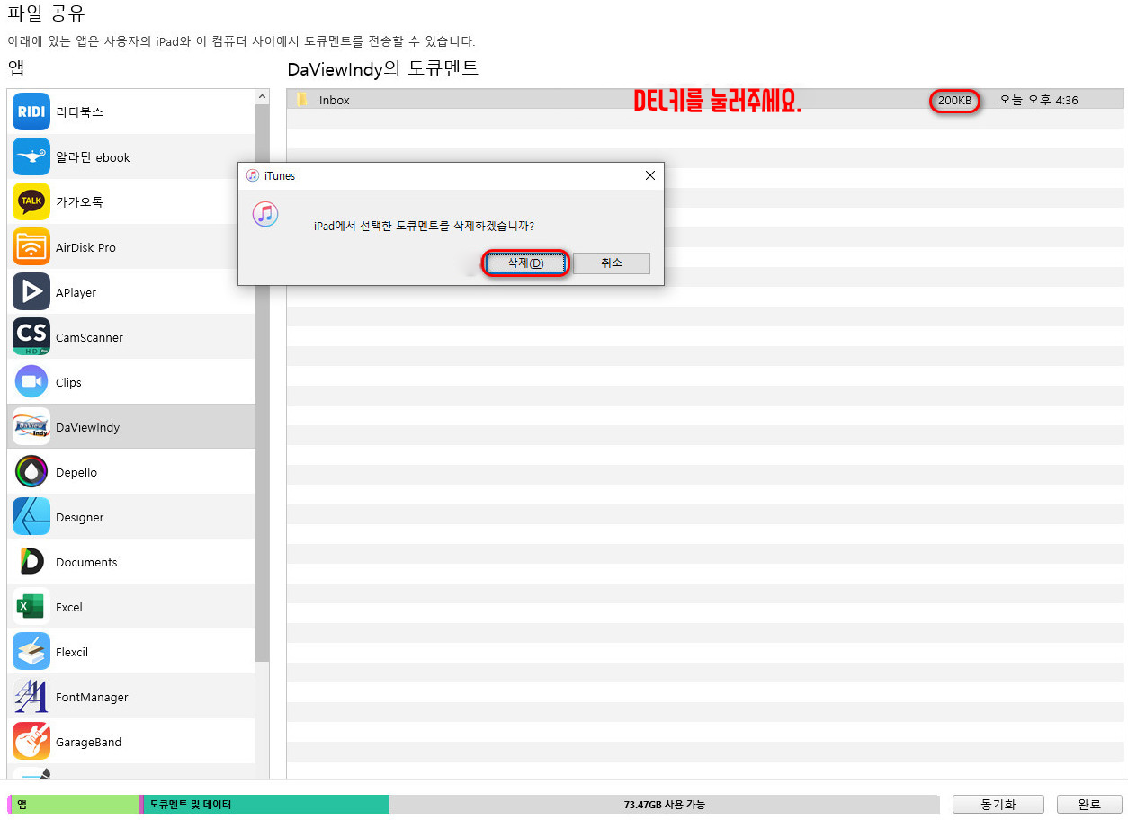 따라서 DaView로 확인한 문서를 완벽하게 삭제하기 위해서는 iPad를 케이블로 컴퓨터와 연결하여 itunes에서 삭제해줘야 하는 불편함이 있습니다.