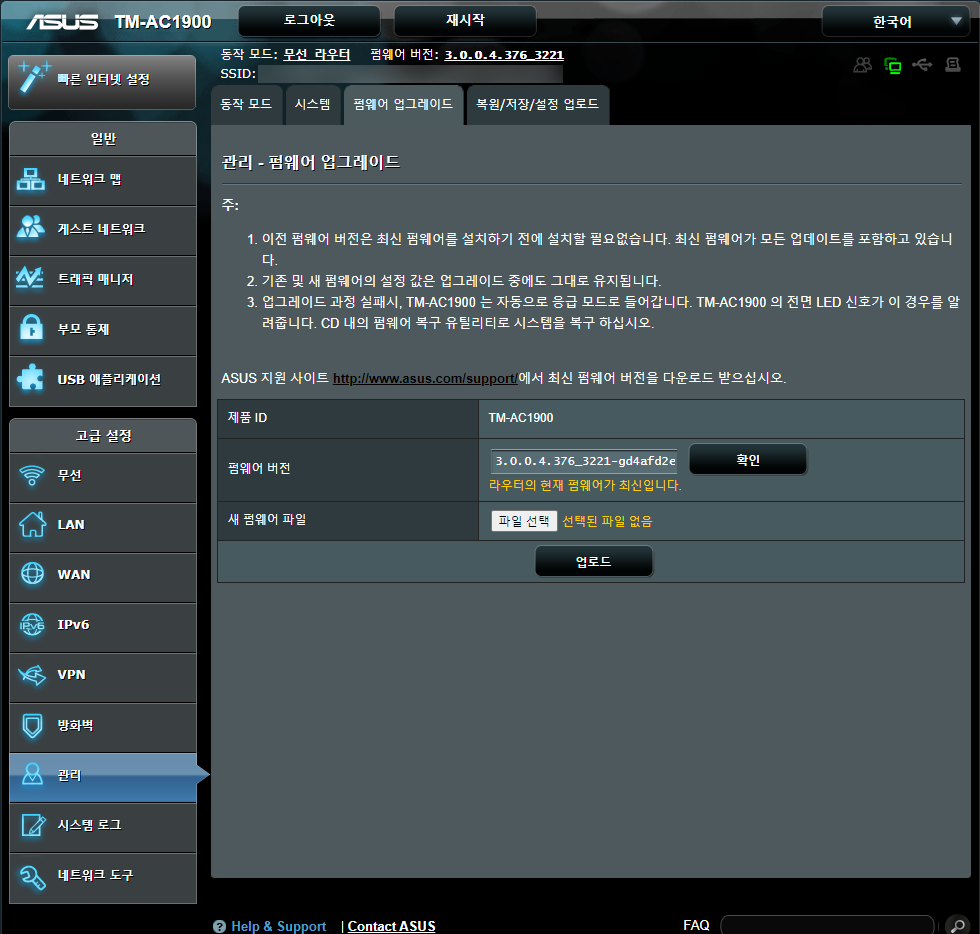 많은 사용자들이 TM-AC1900 공유기 구입 후 Firmware를 멀린 펌으로 바꿔 AC68U로 사용하더군요. 저는 제품 순정을 좋아해서 그냥 그대로 사용하고 있었습니다. 몇 년이 지나도 Firmware가 3.0.0.4.376_3199, "라우터의 현재 펌웨어가 최신입니다"라는 메시지에 의구심이 생겼는데 2020년 12월 Firmware 3.0.0.4.376_3221로 업데이트되었습니다.