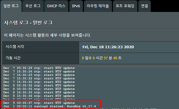 펌웨어 버전이 바뀌게 되면 TM-AC1900 공유기 자체적으로 업데이트됩니다. 시스템 로그를 살펴보니 2020년 12월 9 ~ 10일 사이에 자동으로 업데이트됨을 확인하였습니다. TM-AC1900 제품에 대한 펌웨어를 전혀 관리하지 않나? 이런 의구심이 사라졌습니다.