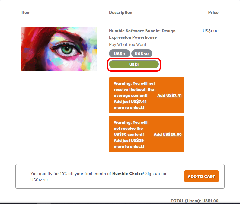 $1달러에 Unlock이 가능합니다. 하지만 주의하셔야 할 점은 다른 게임을 1달러 이상 구매해야 한다는 의미가 아닙니다. Design expression Powerhouse에 나오는 "GET THE BUNDLE" 버튼을 먼저 클릭해서 최소 $1달러 구매를 해야 한다는 의미 입니다.