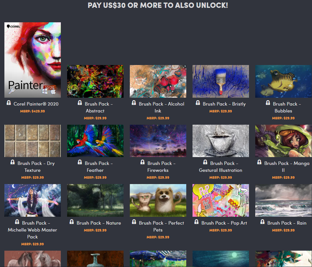 $30달러 또는 그 이상의 경우 모든 Bundle이 Unlock 됩니다. Corel Painter 2020 및 각종 Brush Pack이 다양하게 포함되어 있습니다. 그림 그리기를 좋아하시는 분 그리고 Corel Painter를 주로 사용하시는 디자이너에게 유용할 Bundle 입니다. 워낙 유명한 프로그램이라 저도 잠깐 고민을 했지만 주로 사용하는 프로그램이 Affinity Photo와 Designer라서 그냥 Pass 했습니다.
