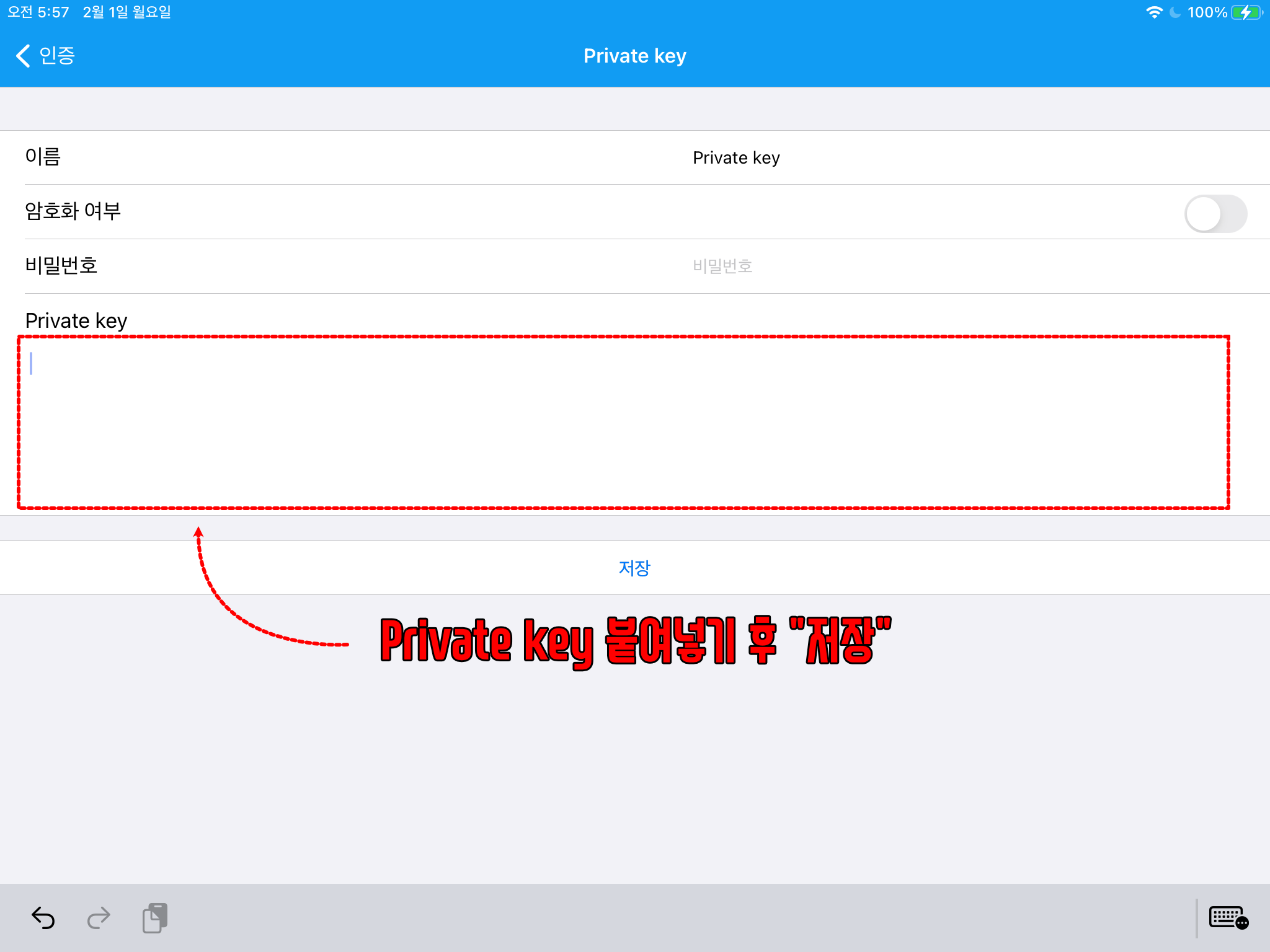 마지막으로 계정정보 설정화면으로 돌아와서 Private key 부분에 "아니오"대신 "Private key"와 같이 변경되었는지 확인하고 저장버튼을 눌러줍니다. 저장이 완료된 후 해당 커넥션을 터치하여 계정에 접속하면 됩니다.