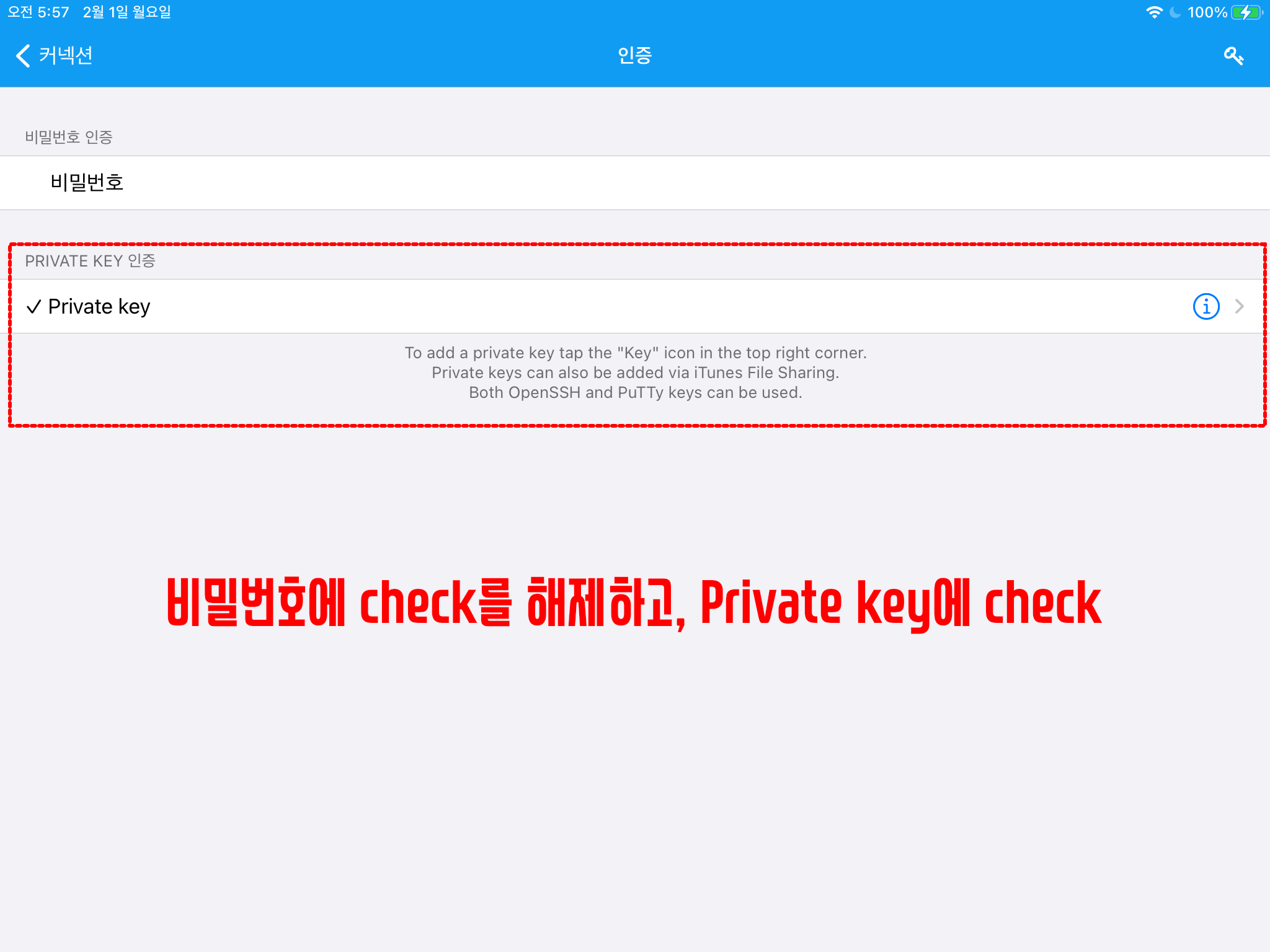 기본적으로 "비밀번호 인증"의 "비밀번호"에 체크되어 있습니다. 체크를 해제하고 아래쪽에 Private key에 check를 해줍니다. 그리고 우측에 보이는 느낌표 아이콘을 클릭합니다.