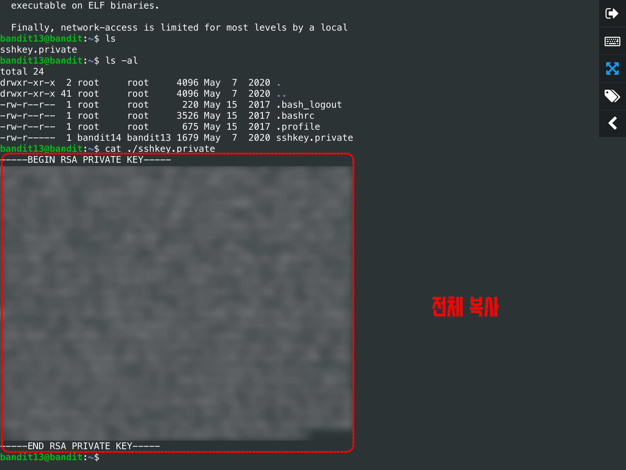 모의 해킹 서버인 bandit wargames의 경우, 각 Level 비밀번호가 상당히 길고 일반적인 영어 단어가 아닌 알파벳 조합으로 되어있습니다. 따라서 매번 접속할 때마다 비밀번호 입력하는 것이 번거롭게 느껴집니다. 애용하는 webSSH 앱에 ssh 계정 정보를 저장해두고 각 level을 통과할 때 마다 저장했던 계정 정보를 복제하고 여기에서 User Id 및 Password만 변경해서 다음 Level로 접속하곤 했습니다. private key를 이용해 접속하기 위해서 역시 이전 level의 접속 정보를 복제하여 아이디를 우선 바꿔줍니다.