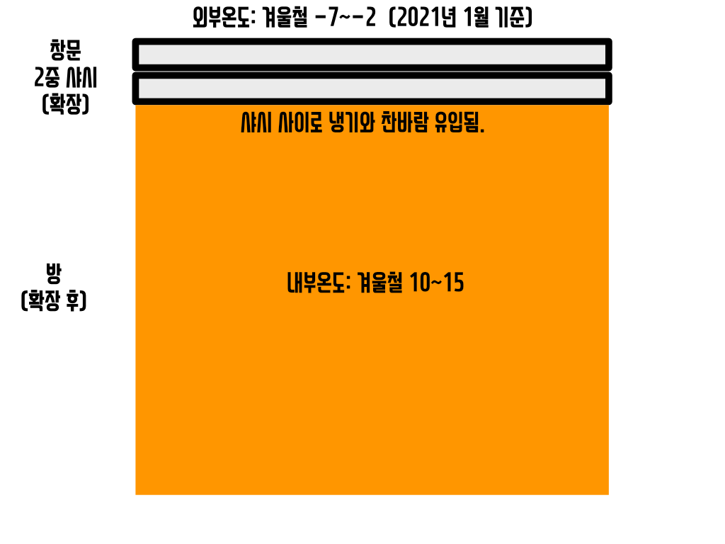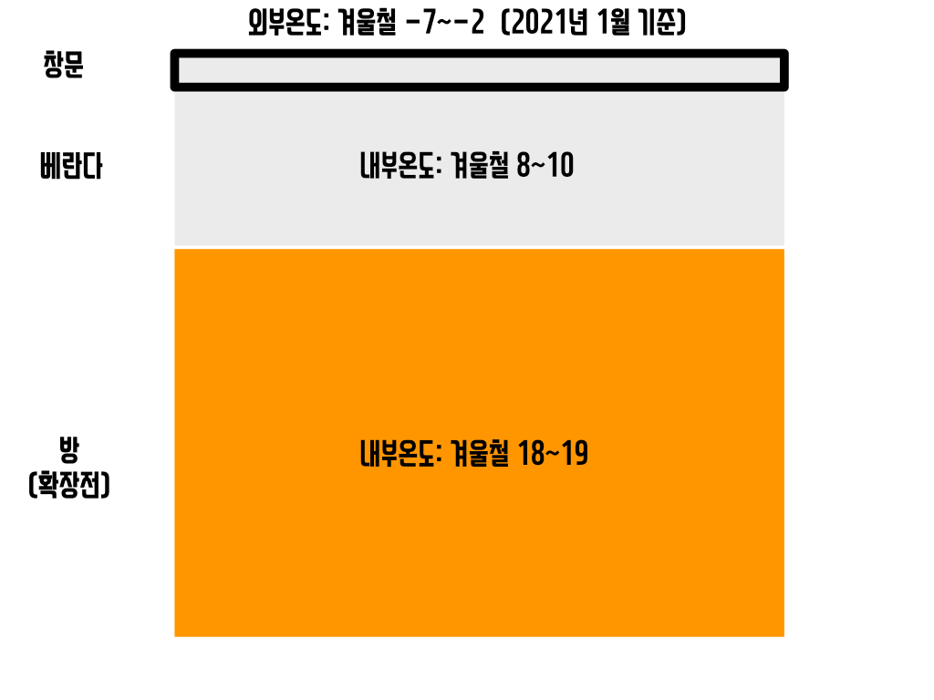 제가 살고 있는 아파트는 이사올 때 부터 확장된 구조였습니다. 따라서 해당 온도는 확장이 안 된 다른방의 실내온도, 베란다 온도를 각각 측정하여 개념적으로 만들어 보았습니다. 베란다가 창문 외부의 낮은 온도와 내부 방 사이에 일종의 버퍼와 같은 역할을 합니다. 따라서 난방을 하지 않아도 확장하지 않은 방의 온도는 약 18~19도 정도를 유지하고 있습니다. 외부의 찬바람이 베란다까지만 유입되기 때문입니다. 베란다의 온도는 8~12도 정도 수준으로 단계적으로 보온효과가 있는 듯 합니다.