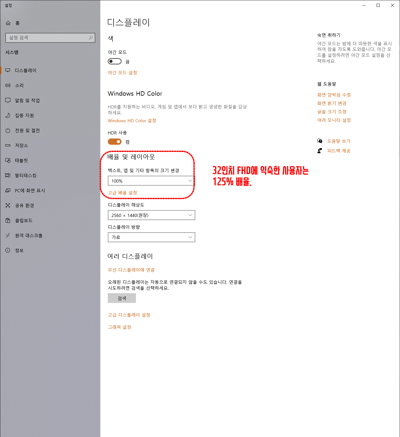 기존에 32인치 FHD 모니터를 사용하셨다면 QA3260K, 2560 X 1440 해상도에서 보이는 글자 SIZE가 FHD 사용시 익숙하던 SIZE 보다 더 적게 보이게 됩니다. 많이 불편하다면 배율을 125% 정도로 변경하시면 32인치, FHD와 유사한 배율로 사용할 수 있습니다.