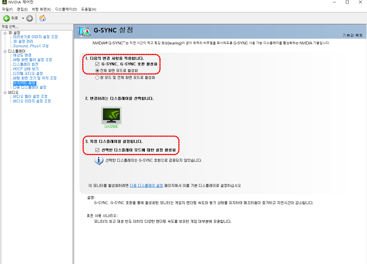 G-SYNC 설정에서 "전체 화면 모드로 활성화", 3번에 "선택한 디스플레이 모드에 대한 설정 활성화"앞에 체크박스에 "체크"를 해줍니다.