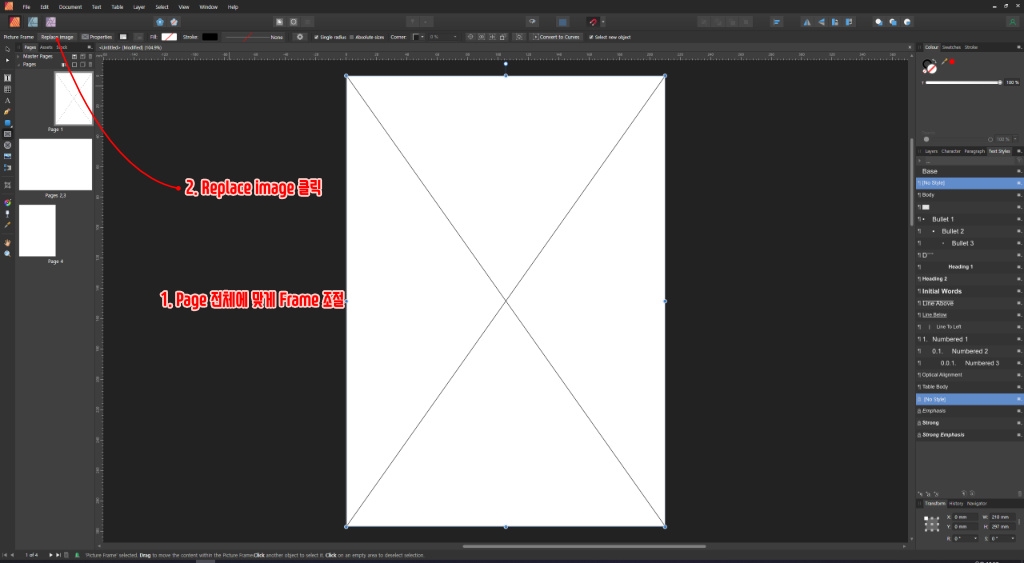 - 만들어진 첫 page를 더블 클릭하고, 좌측 Tool 도구에서 Picture Frame Rectangle Tool[F]을 선택합니다.
