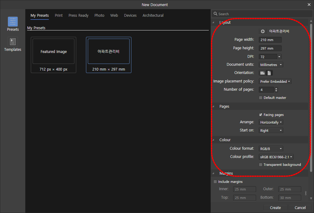 자주 사용하는 Page 설정값의 저장이 필요한 경우, Page width 위에 있는 + 버튼을 클릭하여 My Presets에 해당 설정값의 preset을 설정할 수 있습니다.