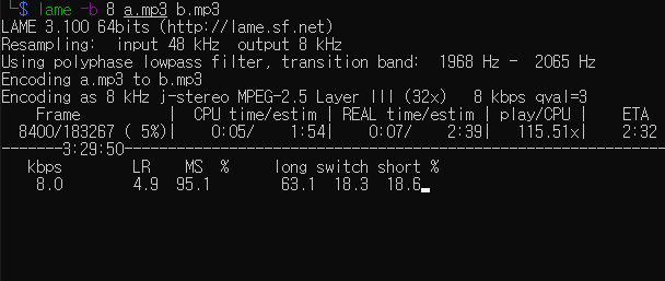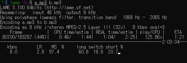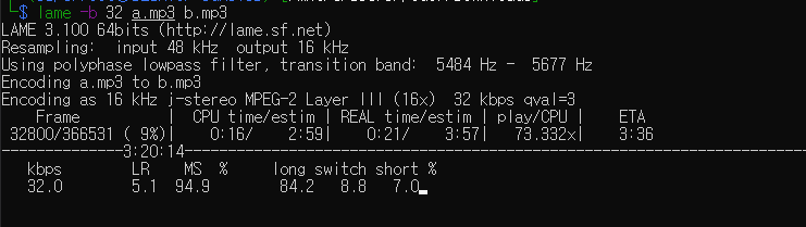 기존 150메가 하던 파일이 -b 16 옵션을 사용했더니 약 25메가로 사이즈가 줄어들었습니다. -b 8까지 줄이는 경우 음질이 많이 안 좋아집니다.