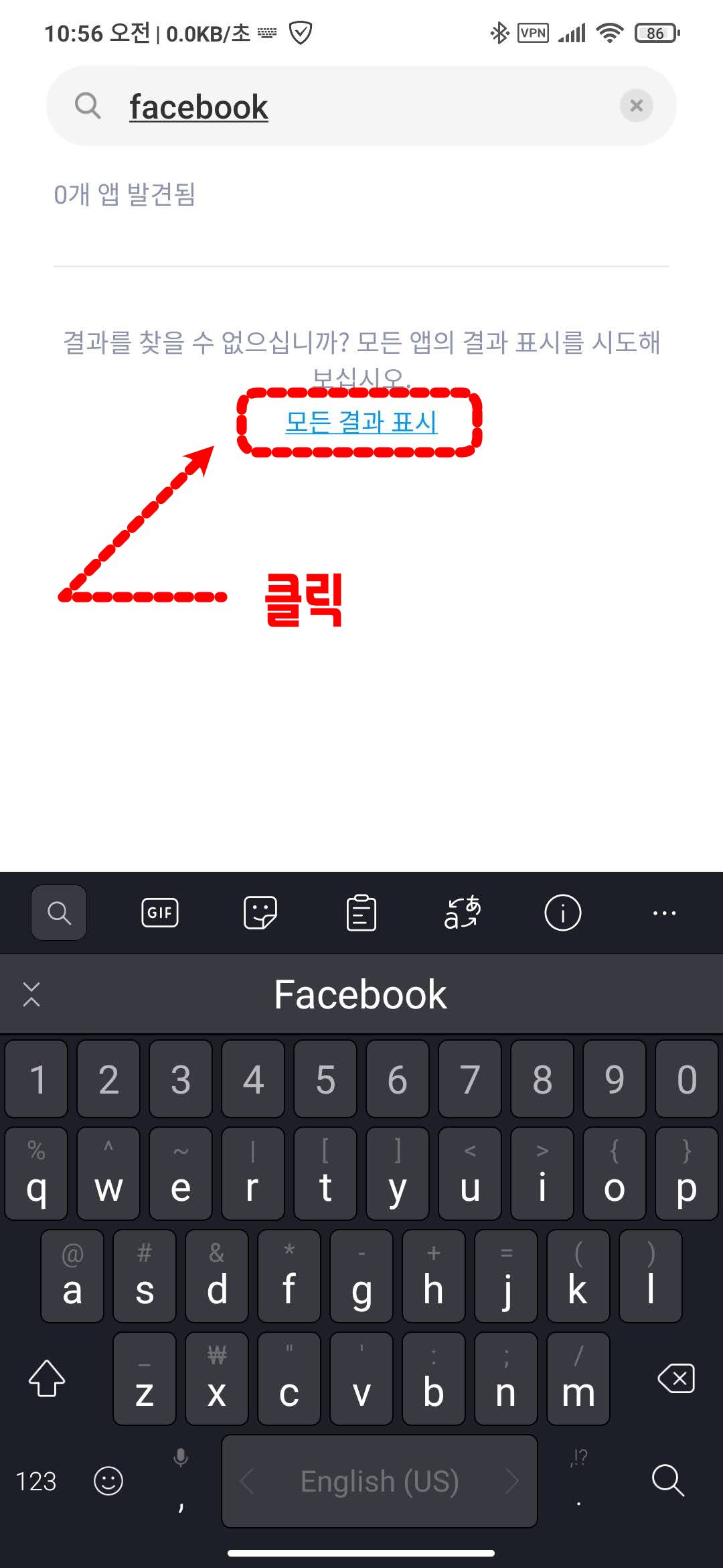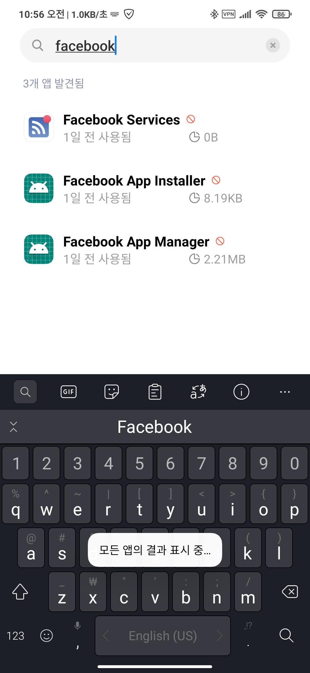 "모든 결과 표시"를 클릭해야 "시스템 서비스" 관련하여 숨겨진 서비스들이 표시됩니다. facebook 관련 앱은 기기 자체에 설치되어 있는 "시스템 서비스"관련 앱이라서 루팅 없이는 삭제가 불가능합니다.