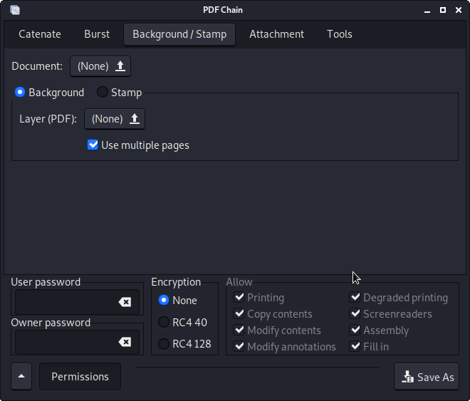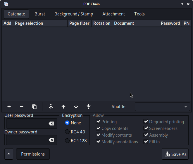"Catenate" 메뉴에서 PDF 문서를 작성하고 하단에 있는 "Permissions" 메뉴를 통해서 password를 설정할 수 있습니다.