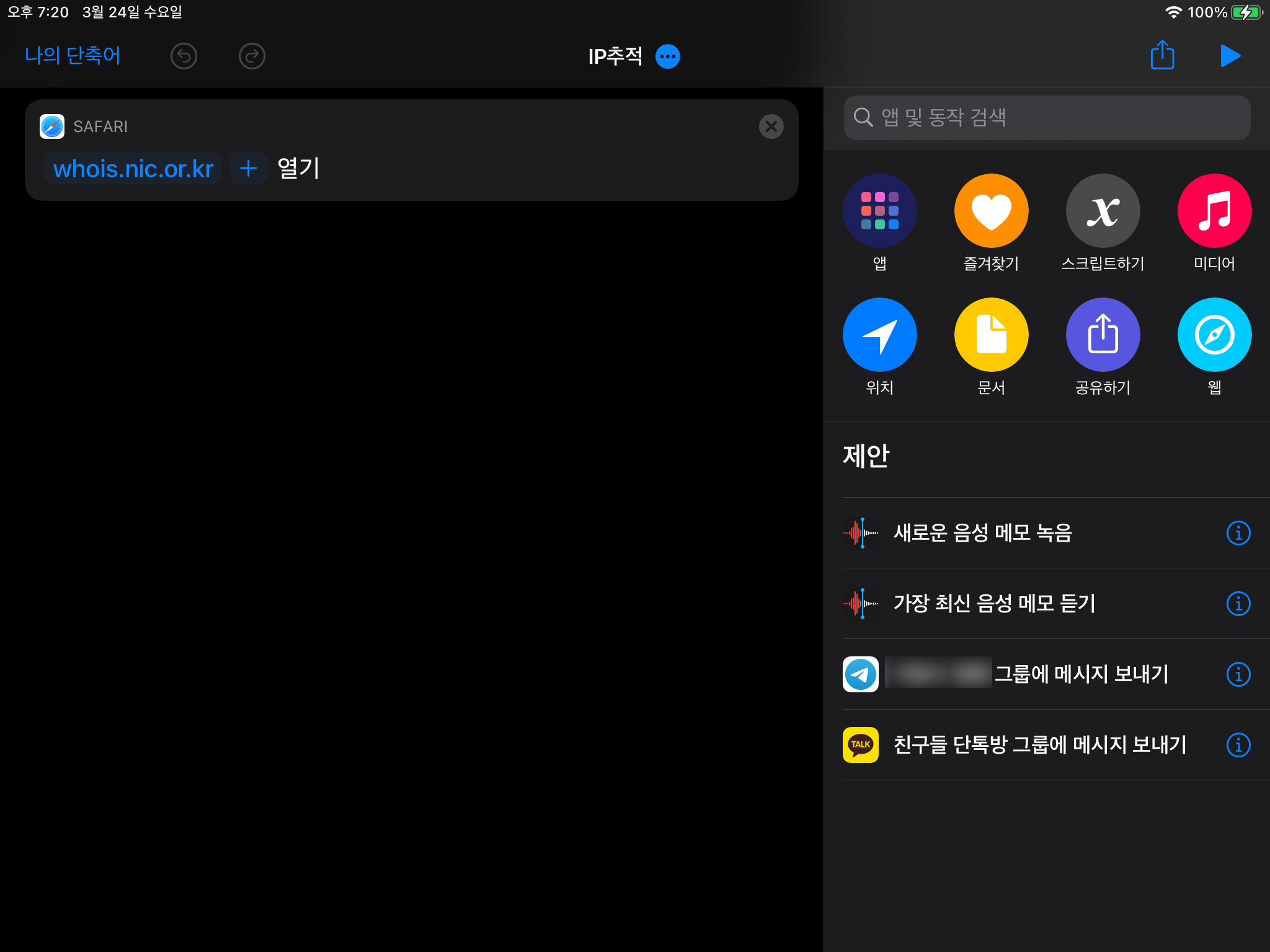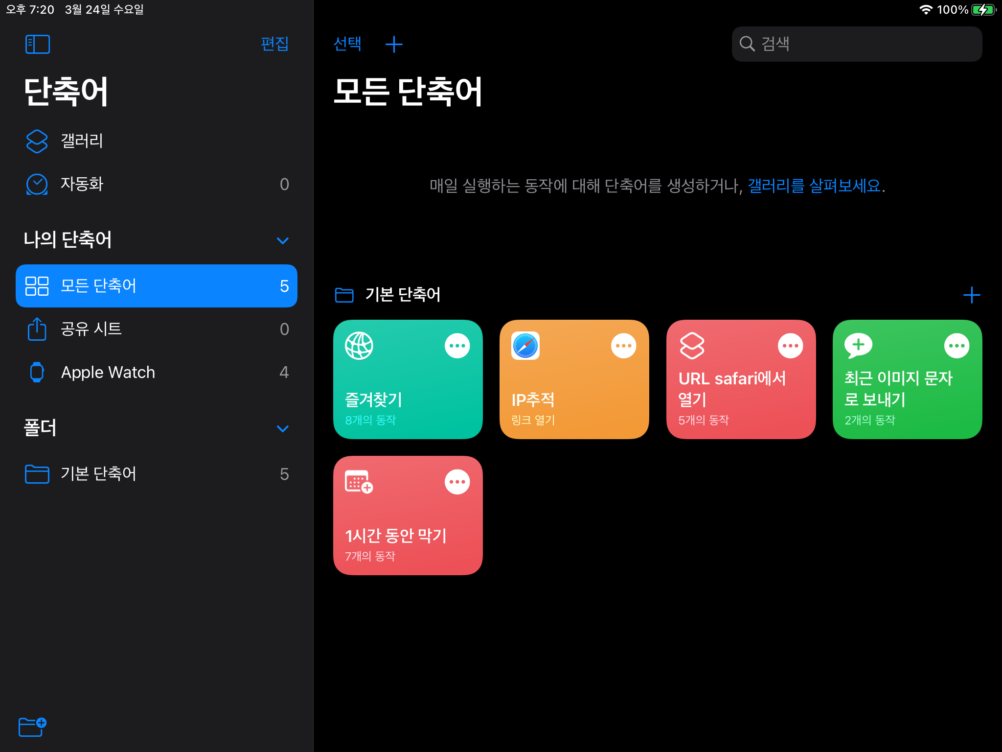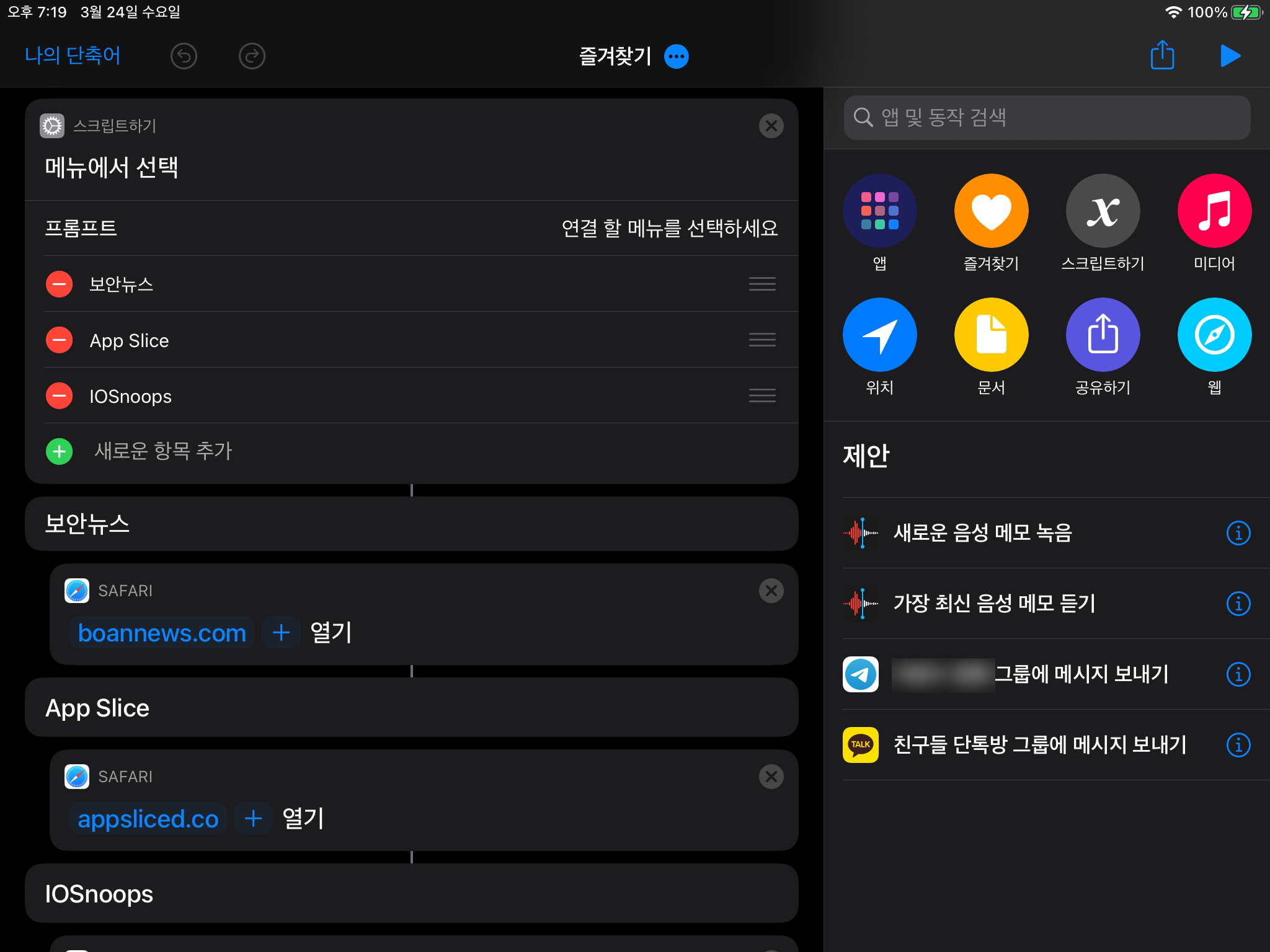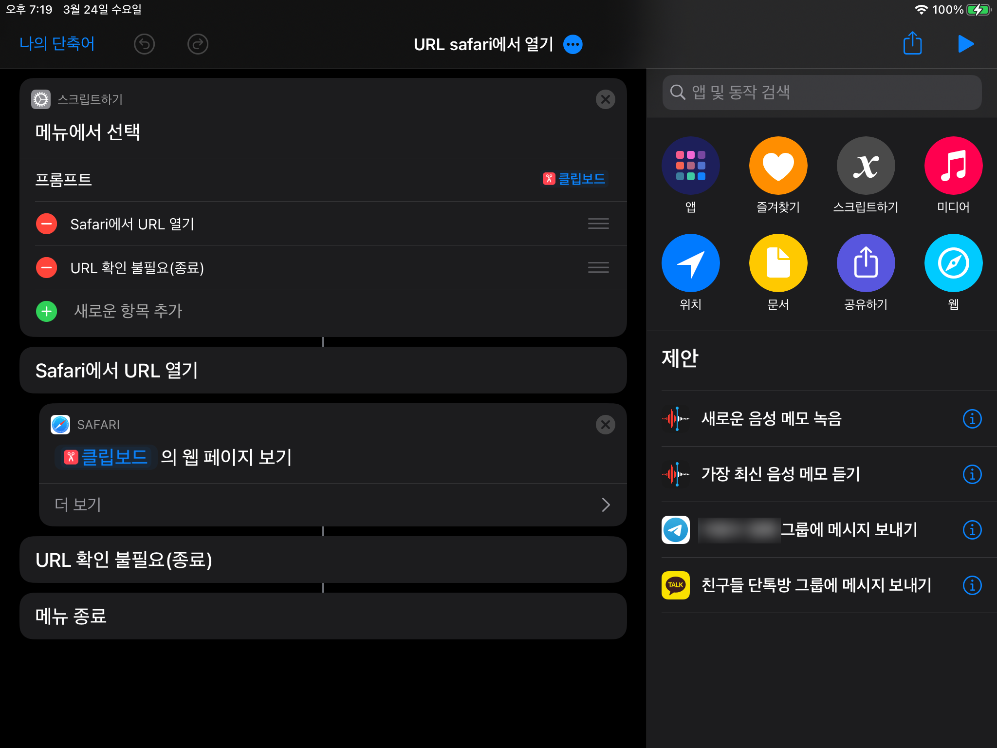 처음부터 너무 어려운 단축어를 만들어보겠다는 생각보다는 진짜 간단한 단축어부터 하나씩 만들어가며 사용법을 익히는 것이 더 좋을 것 같습니다.