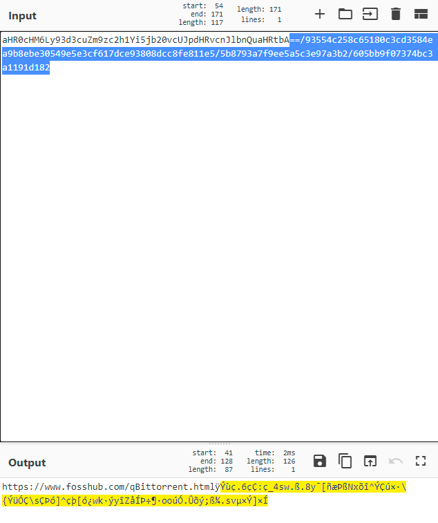 fosshub.com/qBittorrent.html 뒤쪽으로 문자열이 깨져서 보이네요. 폰트 문제인가 싶어서 CyberChef에 방문해서 다시 해당 문자열을 decode 해봤습니다.