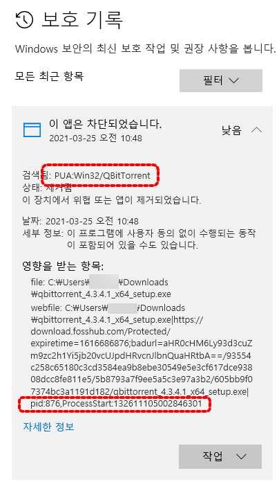 Windows Defender에서 다운로드 받은 파일을 자동으로 삭제한 후 6시간 정도 잊고 있었습니다. 그리고 다시 Qbittorrent로 검색하여 최신 파일을 다운로드 받았는데, 이번에는 크롬 브라우저에서 정상적으로 다운로드되고 Windows Defender에서도 바이러스로 검색이 안되네요....정말 수상합니다.