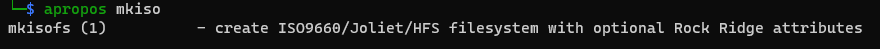 리눅스에서 뭔가 필요한 기능이 있다면 apropos 뒤에 관련 단어를 입력해보면, 해당 단어가 포함된 명령어가 모두 list로 출력됩니다. apropos iso 또는 apropos mkiso만 입력해보면 관련된 명령어가 표시됩니다.