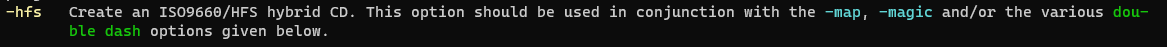 mkisofs -J -R -hfs 와 같이 함께 사용이 가능하며 -hfs 옵션은 Mac 운영체제에서 확인할 수 있도록 만들어주는 옵션입니다. 하이브리드 iso image를 만들려면 -J -R -hfs를 사용하면 됩니다.