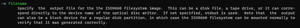 -o 뒤에 filename.iso 와 같이 output 파일명을 입력해주는 옵션입니다. 필수입니다.