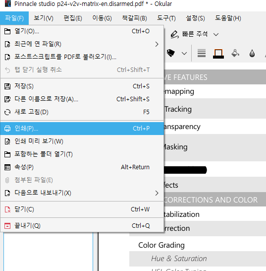 따라서 블랙 마킹을 적용한 PDF를 타인에게 전달해야 하는 경우 "파일" -"인쇄" 기능을 이용해서 PDF 문서로 PRINT를 해서 최종 문서로 만들어주는 과정이 추가적으로 필요합니다. (중요)