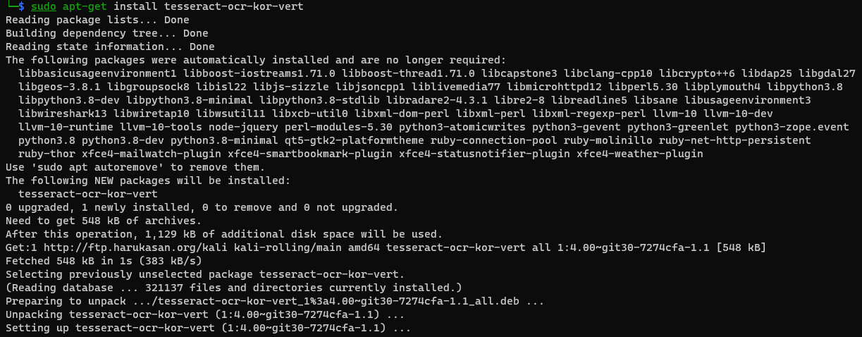 명령어: sudo apt-get install tesseract-ocr-kor