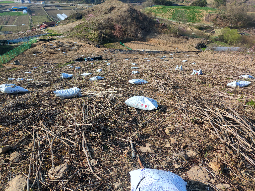 두릅밭에서 두릅을 모두 수확하고, 내년 농사를 위해서 퇴비 20kg 짜리 90포대를 옮겼습니다. 으햐햐햐, 두릅밭에 경사가 좀 있어서 다른 농작물보다 두릅이 더 적당하다는 부모님 말씀~