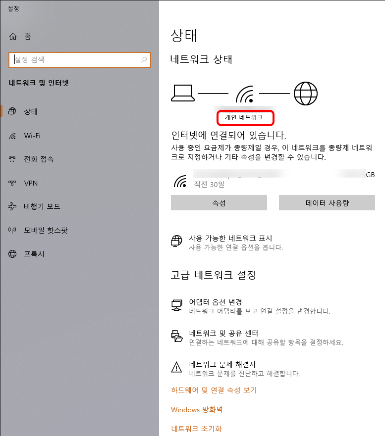 윈도우 설치 시 "개인 네트워크", "공용 네트워크" 둘 중에 어떻게 사용할지 물어보게 됩니다. "개인 네트워크"로 설정하신 분은 "네트워크 상태"에 "개인 네트워크"라고 표시되며, "공용 네트워크"로 설정하신 분은 해당 부분에 "공용 네트워크"라고 표시됩니다.