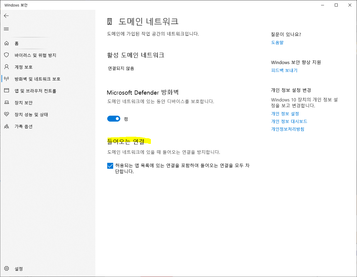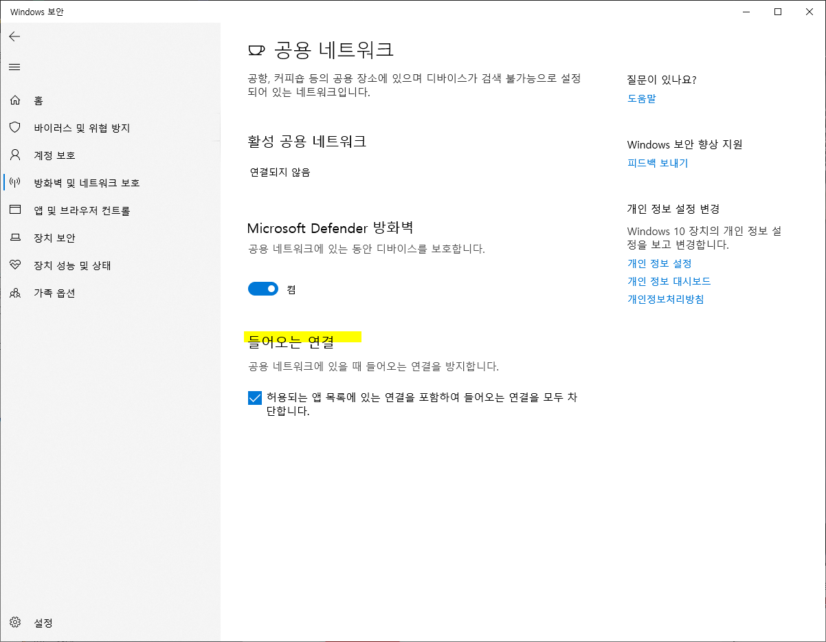 윈도우 디펜더 - "방화벽 및 네트워크 보호"에서 "개인 네트워크" 사용자의 경우, "도메인 네트워크" 및 "공용 네크워크"에서 "들어오는 연결" 항목에서 "허용되는 앱 목록에 있는 연결을 포함하여 들어오는 연결을 모두 차단합니다"에 체크를 해두는 것도 괜찮습니다.