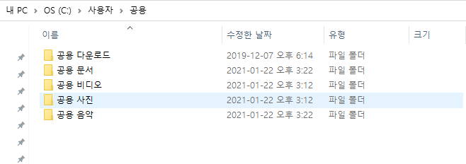 "공용" 또는 "Public"이란 폴더가 공용계정이며, 해당 폴더에는 기본적으로 아래 사진과 같이 "공용 다운로드", "공용 문서', "공용 비디오", "공용 사진", "공용 음악" 폴더가 기본 폴더입니다.