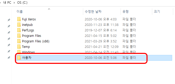 탐색기를 실행하시고 c:\사용자 폴더를 확인합니다.