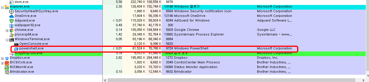 일반적으로 Powershell을 사용자가 사용하고 있지 않다면 해당 프로그램은 process에 떠 있을 이유가 전혀 없습니다.