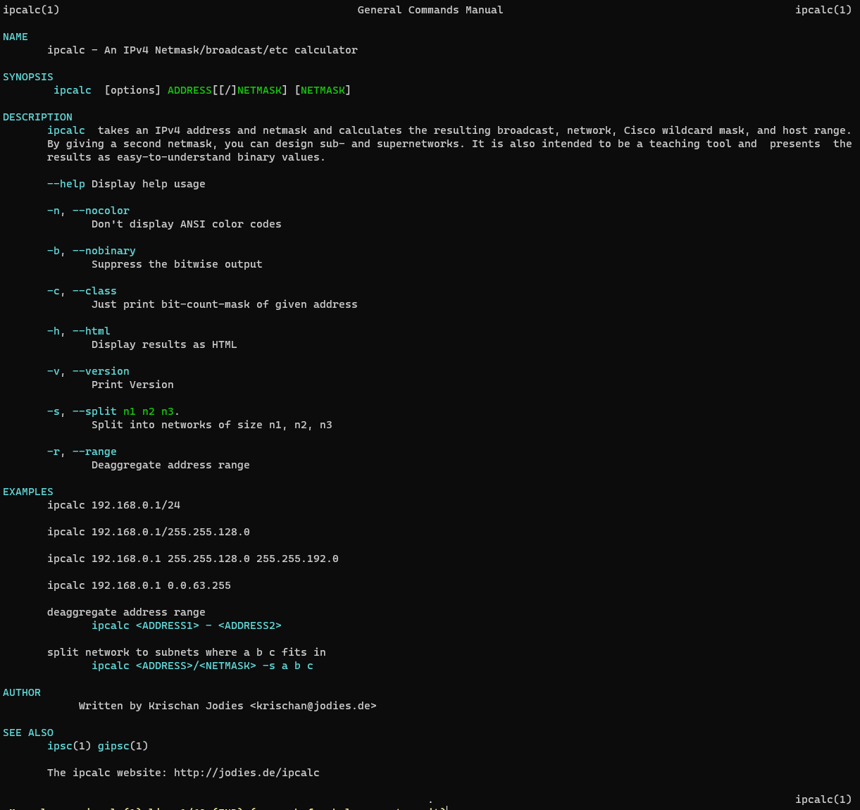 구체적인 사용법을 확인하기 위해서 man ipcalc 명령어를 입력합니다.