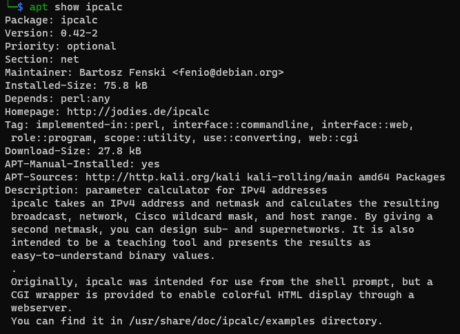 설치 명령어는 sudo apt-get install ipcalc이며, 이미 설치된 경우 which ipcalc && apt show ipcalc와 같이 명령하면 위 사진처럼 관련 내용이 표시됩니다.