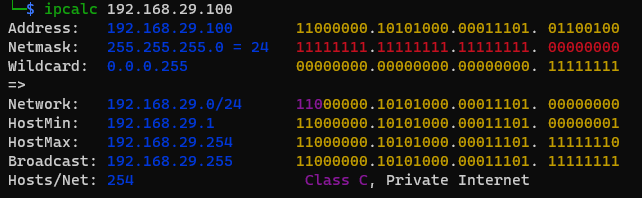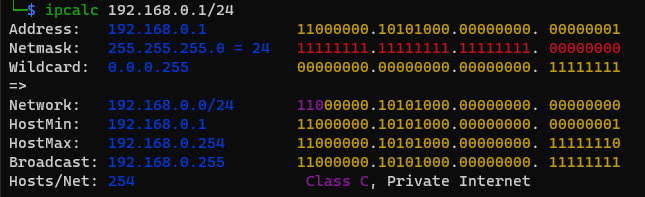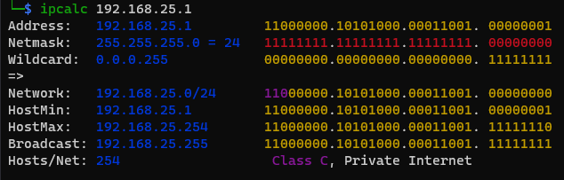 기본적인 명령어로 ipcalc IP를 입력하면, 해당 IP의 subnet mask, cisco의 wildcard, Broadcast, Class 등 을 확인할 수 있습니다.