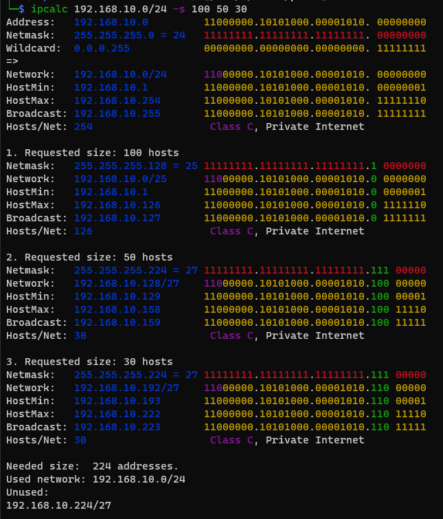ipcalc 192.168.10.0/24 -s 100 50 30