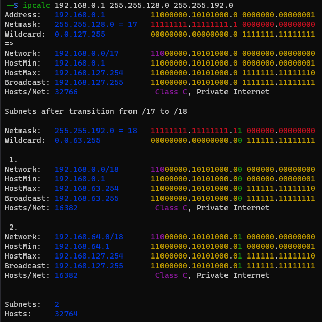 prefix 17, 즉 subnet mask 255.255.128.0에서 prefix 18(255.255.192.0)으로 transition 계산 명령어입니다.