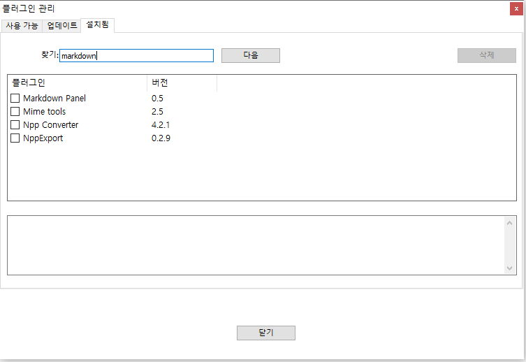 [플러그인] 메뉴에서 "markdown"으로 검색하여 "Markdown Panel"을 설치합니다.