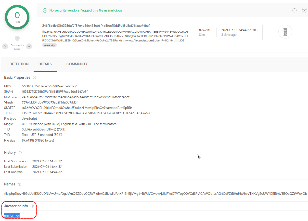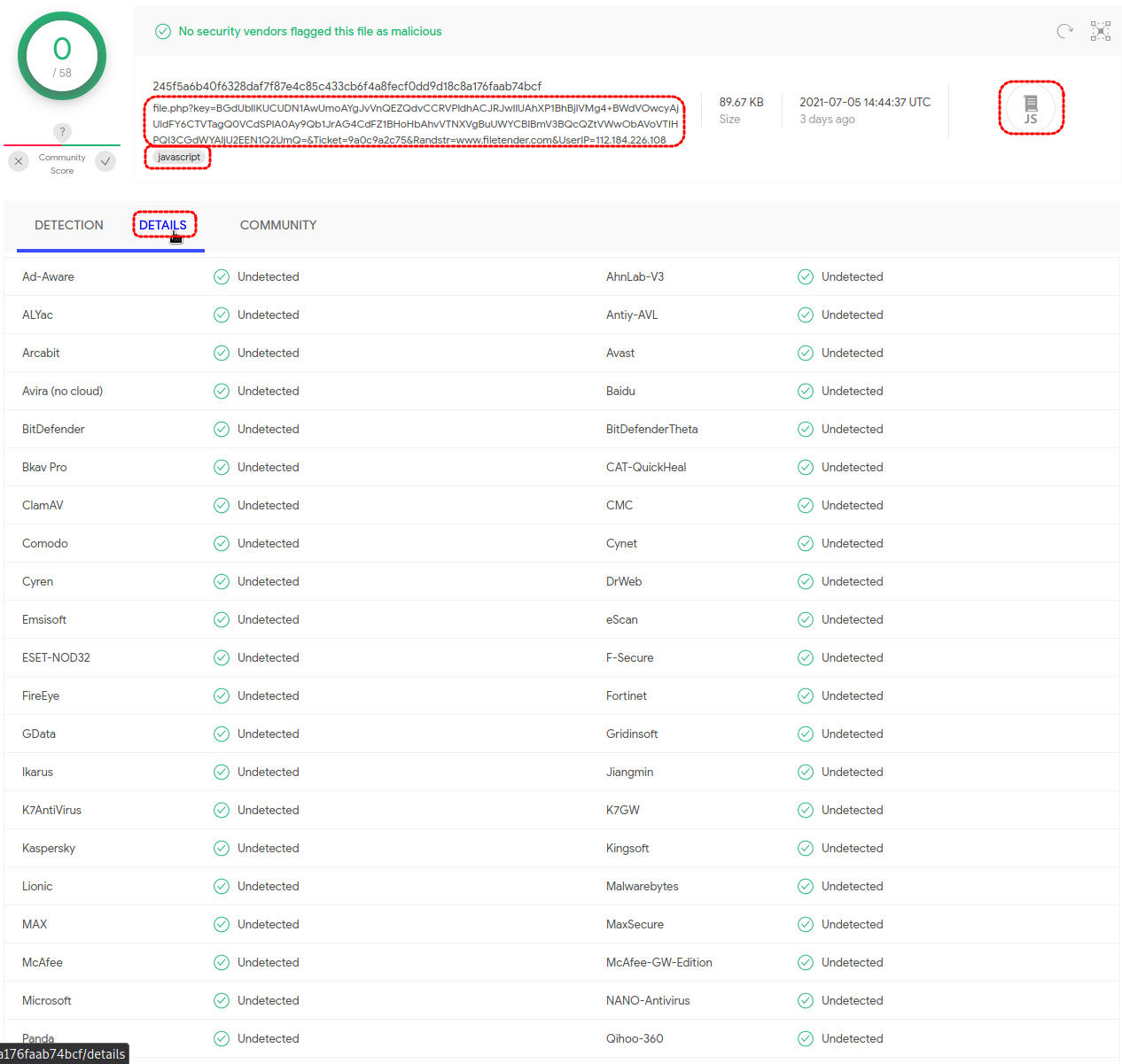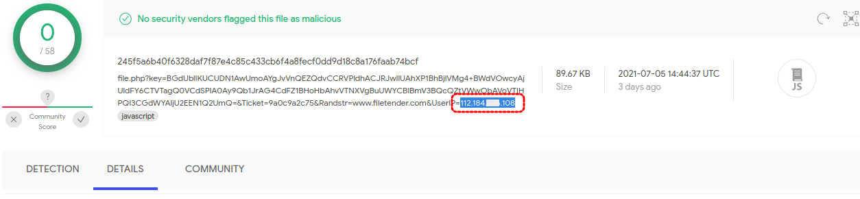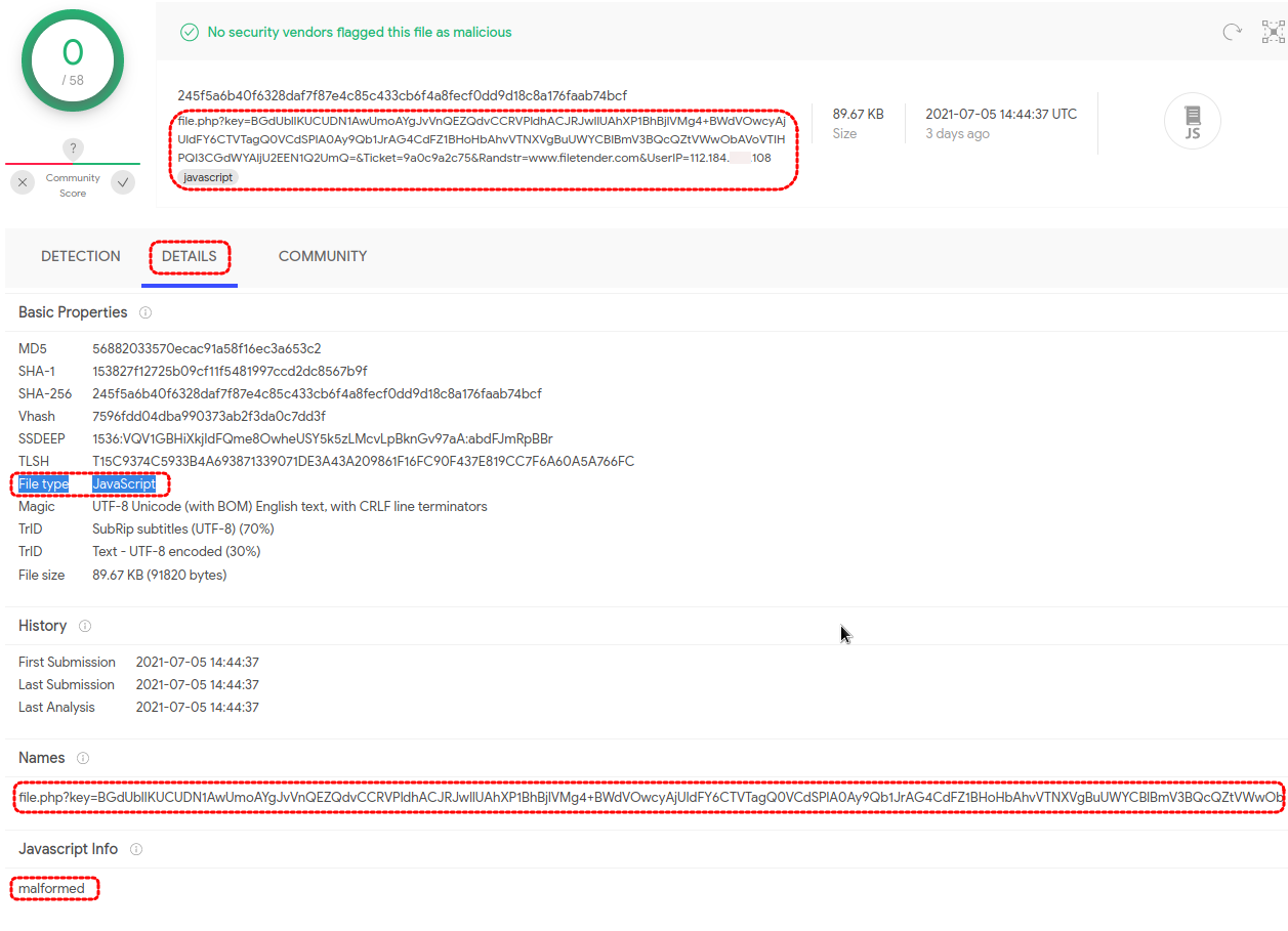 수상한 부분에 대해서 "빨간색 사각형"으로 하이라이트 했는데요, 위에서부터 살펴보면, "file.php 파일~~UserIp에 나오는 IP, File Type에 JavaScript, Javascript Info에 malformed.