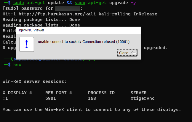 Windows10 WSL2, Kali Linux GUI를 사용하기 위해 kex를 주로 사용하는데요, 간혹 "unable connect to socket: Connection refused(10061)"로 kex를 사용하지 못하는 경우가 있습니다.