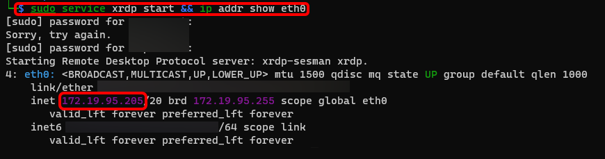 kex에 에러가 발생했다면, sudo kex stop && sudo kex kill 명령어로 관련 프로세스를 종료시키시고 sudo service xrdp start && ip addr show eth0 명령어를 사용해서 xrdp 서비스를 시작시키고 추가로 Kali Linux의 local IP를 확인합니다.
