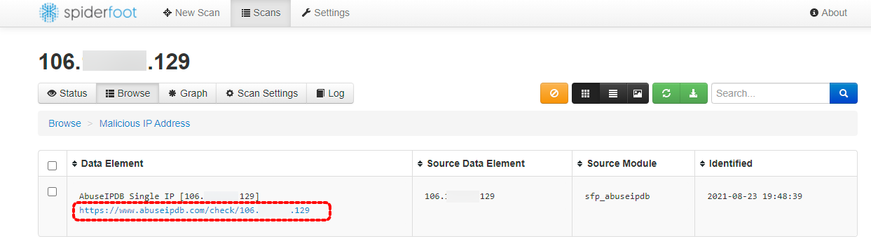 spiderfoot의 abuseipdb module을 실행한 결과인데, 하이라이트 된 링크를 클릭하게 되면, abuseipdb 홈페이지에 자동으로 접속되며, 해당 IP와 관련된 정보를 바로 확인할 수 있습니다.
