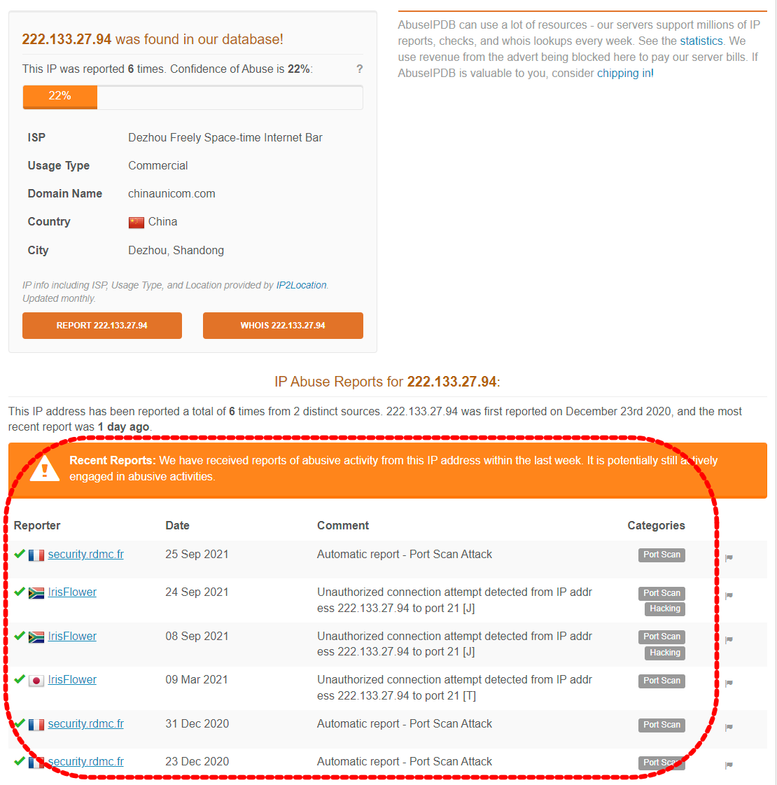 Recent Reports와 같은 결과가 없이 나온다면, 특별한 해킹 시도가 없었던 IP라고 보시면 됩니다.
