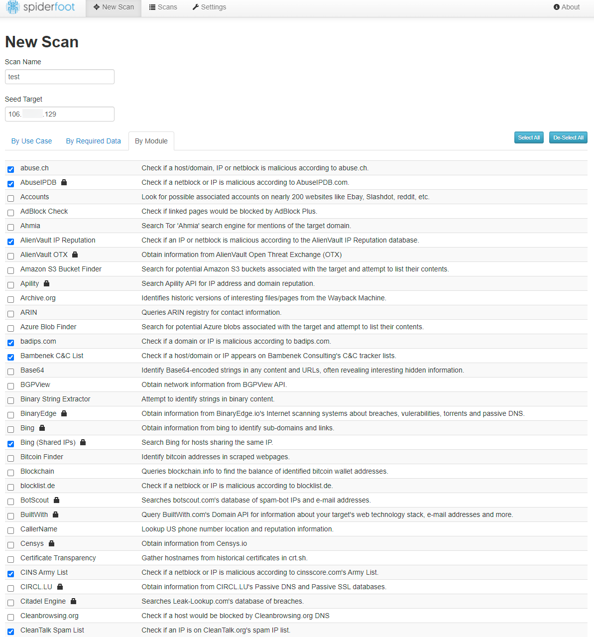 Scan "All"의 경우, spiderfoot의 모든 모듈을 사용해서 scan 하기 때문에 상당히 오랜 시간이 걸립니다.