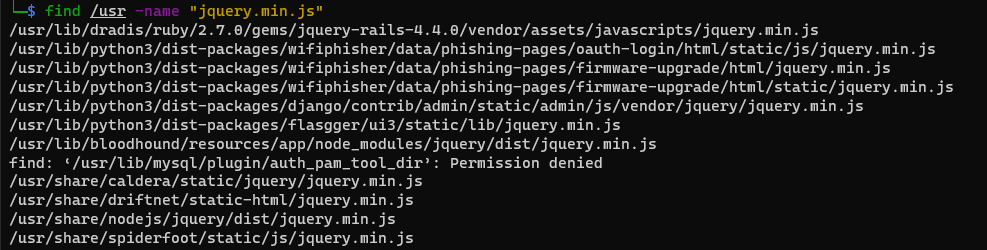 심볼릭 링크를 수정하면 다른 프로그램에 영향을 줄 수 있기 때문에, 해당 폴더에 jquery.min.js을 복사하기로 결정하고 시스템에서 jquery.min.js 파일이 있는지 검색해 봤습니다.
