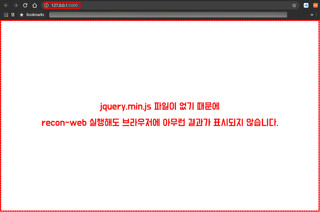그러나, WSL2에 설치된 Kali Linux에서 recon-web을 실행하고 웹 브라우저에서 http://127.0.0.1:5000으로 접속을 하면, "GET /jquery.min.js HTTP/1.1" 404 에러를 마주하게 됩니다.