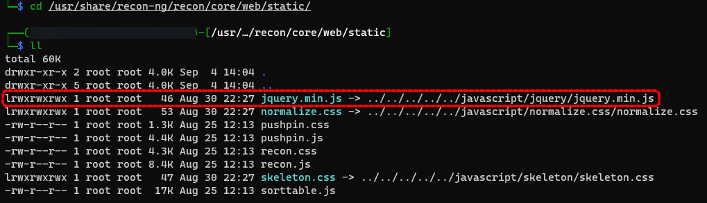 jquery.min.js 파일은 /usr/share/javascript/jquery/jquery.min.js와 심볼릭 링크가 되었음을 확인할 수 있습니다.