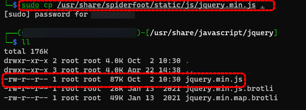 다양한 프로그램에 jquery.min.js 파일이 있는데요, 이 중에서 spiderfoot에 포함되어 있는 jquery.min.js 파일을 복사하기로 결정했습니다. 아래 명령어는 /usr/share/javascript/jquery 폴더에서 실행합니다.